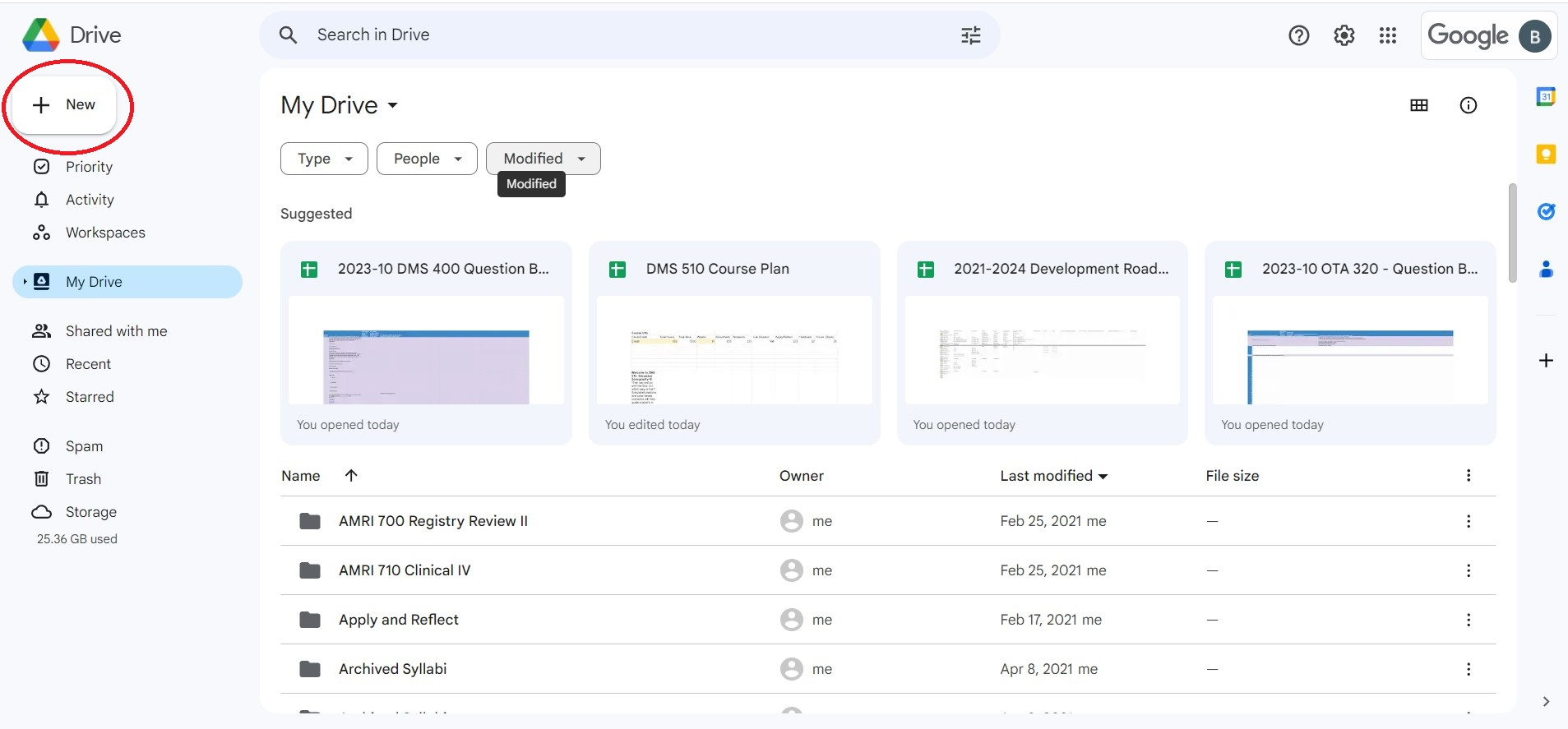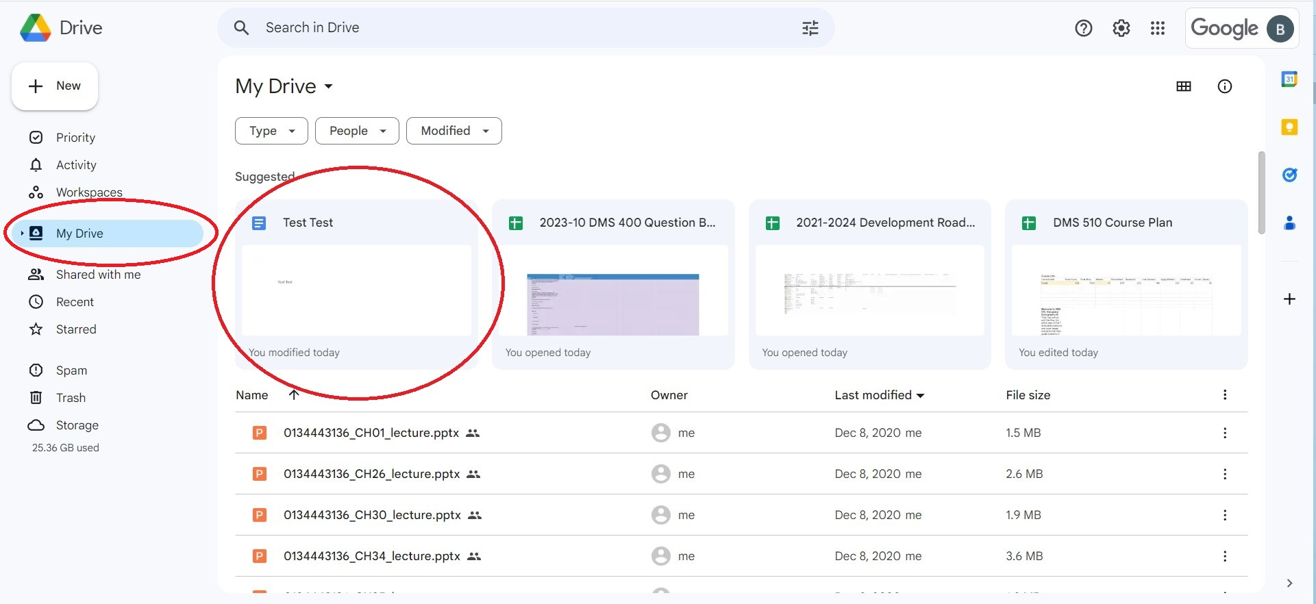 4. Once you close your file and return to your Google Drive Home Screen, ensure that My Drive is selected. You should see the document that you just created. *If you DO NOT see your document, search for it in the Search in Drive search bar at the top of the screen.