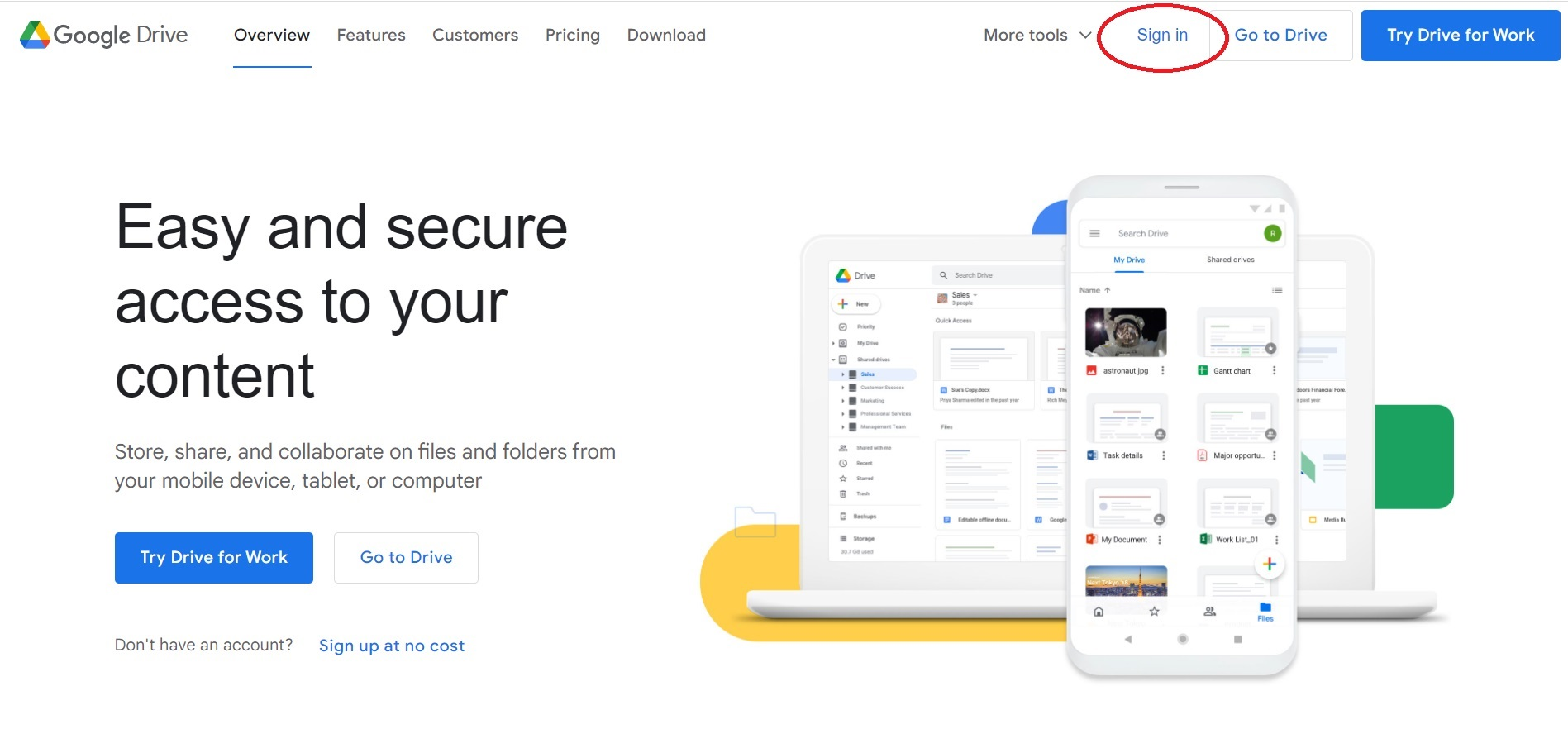 1. Navigate to https://www.google.com/drive/ and Sign In using your CBD Google account (the same one you use to log in to Moodle. If you need to reset your CBD Google Password, click here for instructions.)