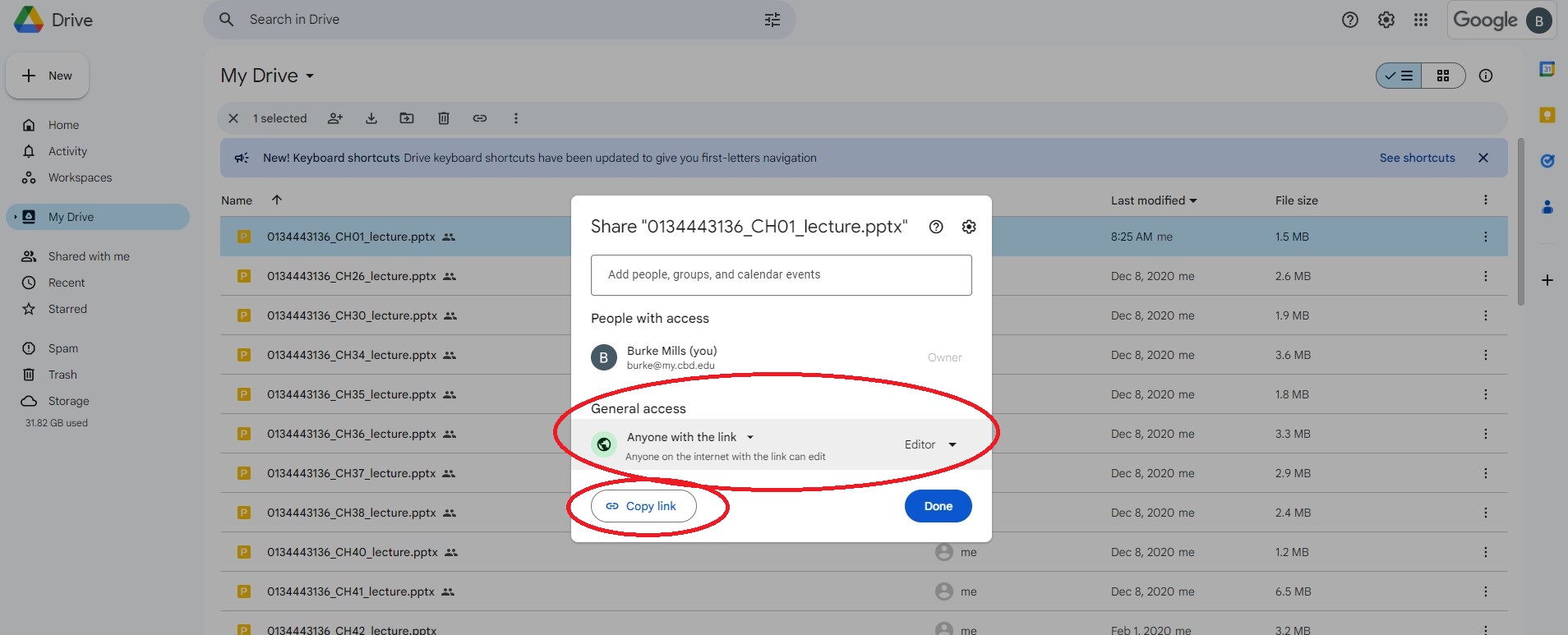 7. You will see the below pop-up. Under the General access, select the drop down and ensure Anyone with the link AND Editor is indicated. Click Copy link and then click Done.